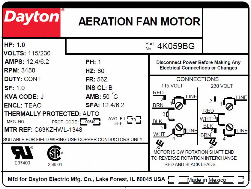 DAYTON Aeration Fan Motor 1, 3,450, 115/230V AC, 56Z, Auto, 1 Motor
